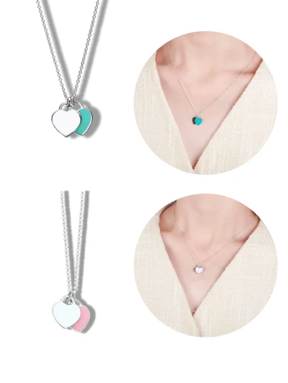 Collar de doble corazón de plata esterlina S925, rosa y azul, diseño clásico y sencillo, collar de joyería para mujer, regalo navideño. - rosa - Añade 1