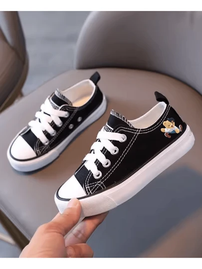 Zapatos para niños, zapatos de lona a la moda para niñas, detalle de oso primavera 2025, nuevos zapatos casuales cómodos de suela suave para niños, zapatos de tablero para padres e hijos S - Blanco y Negro - Añade 1