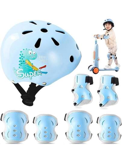 Protecciones para Patinar Niños, Juego de Casco de Bicicleta, Rodilleras, Coderas, Muñequeras, TamañO Ajustable, Equipo Protector Apto para Monopatín, Ciclismo, Mini Bike Riding - azul - Añade 7