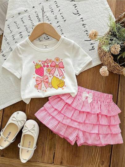 LMoss Kids Set de 2 piezas de camiseta de punto de cuello redondo de unicolor y pantalones cortos con volantes a rayas para niña bebé - Multicolor - Añade 1