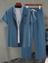 2 piezas Conjunto informal ligero para hombre - Camisa de manga corta con bloques de color y rayas, con un solo botón, y pantalón largo de unicolor, adecuado para ir al trabajo y uso casual