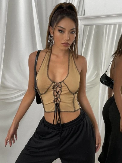 Top halter corto con cordón trasero con cordón - Caqui - Añade 5
