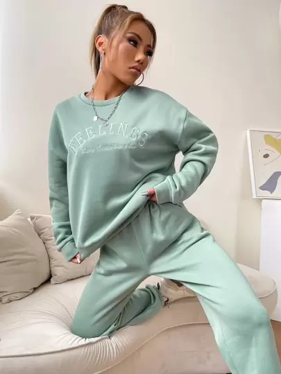 SHEIN Unity Pullover con bordado de letra de hombros caídos & Pantalones deportivos - verde menta - Añade 1