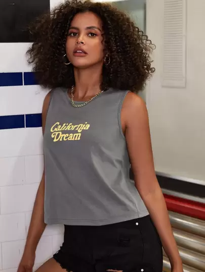 Top Corto Sin Mangas Con Estampado De Letras - Gris - Añade 5