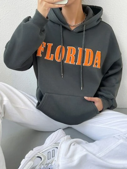 Capucha con estampado de letra de hombros caídos con cordón - Gris - Añade 5