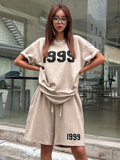 DAZY con estampado de letra Camiseta de hombros caídos & de cintura con cordón Shorts - Beis - Añade 1