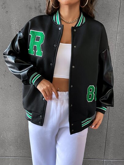 Cazadora de universidad con parche de letra ribete de rayas de hombros caídos - Negro - Añade 5