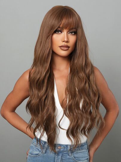 HAIRCUBE Peluca ondulada rizada marrón de 26 pulgadas, pelucas de cabello sintético hermosas románticas con pelucas con flequillo - Marrón - Añade 1