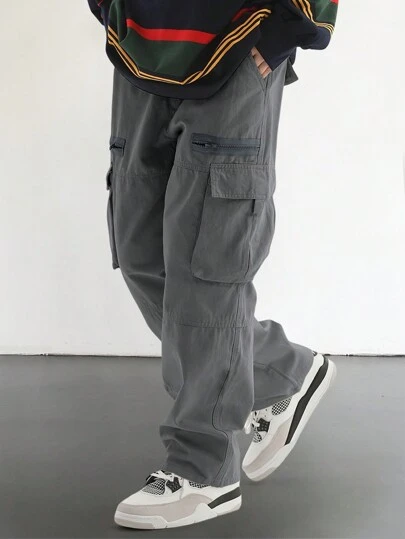 Manfinity EMRG Pantalones cargo de hombre con ajuste holgado y bolsillos con solapa a los lados, estilo de los años 2000, otoño - Gris Oscuro - Añade 1