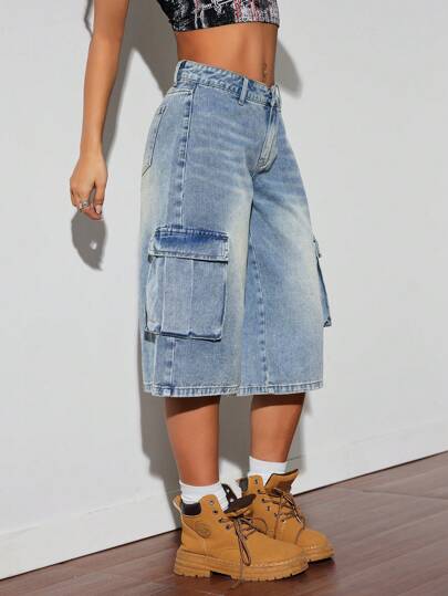 SHEIN ICON Pantalones capri de mezclilla de talle bajo hasta la rodilla para mujeres - Lavado ligero - Añade 1