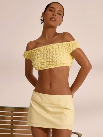 MUSERA Top acortado con textura y volantes de hombros descubiertos, elegante para vacaciones de primavera, estilo bohemio, Ibiza, playa. Elegante para casa de playa, vacaciones - Amarillo - Añade 5