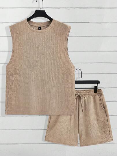 Manfinity Homme Conjunto De Chaleco Y Pantalones Cortos Casuales De Color Sólido Para Hombres - Caqui - Añade 9