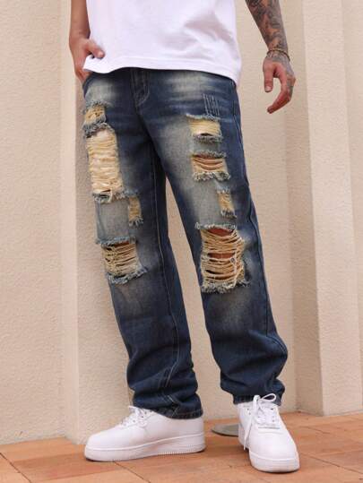 Manfinity LEGND Jeans rectos casuales desgastados y lavados para hombre - Azul lavado medio - Añade 7