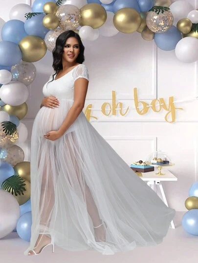 Vestido de maternidad de encaje con malla para sesión de fotos o baby shower - Blanco - Añade 1