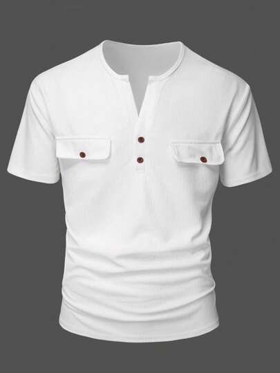Manfinity Homme Camiseta de hombre de manga corta, cuello en V y abotonadura a presión de unicolor - Blanco - Añade 5