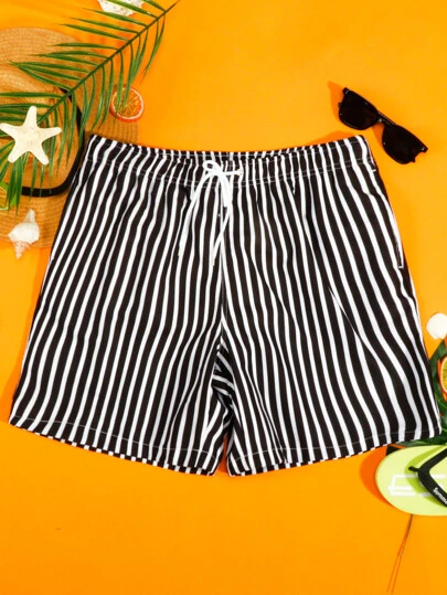 Manfinity Hombres Shorts de natación de rayas de cintura con cordón - Blanco y Negro - Añade 1