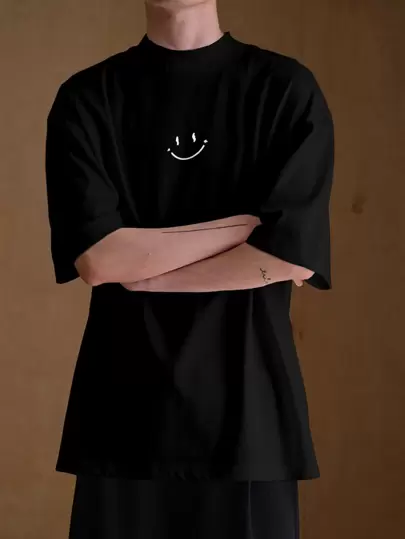 Manfinity Hypemode Camisetas de hombre en ajuste holgado con manga corta caída gráfica de cara, casual de verano en poliéster - Negro - Añade 1
