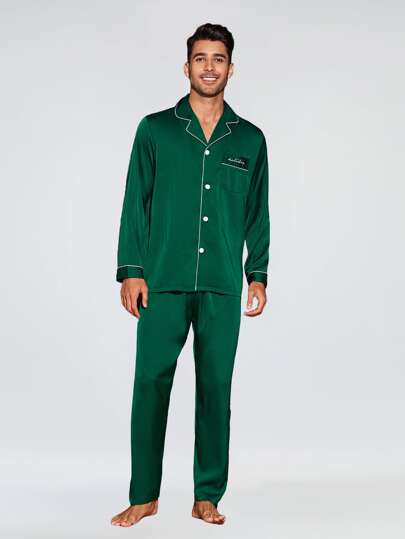 Hombres Conjunto de pijama ribete en contraste con bordado de letra - Verde - Añade 1