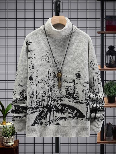 Manfinity Hombres Jersey con patrón de dibujo cuello alto - Gris - Añade 5