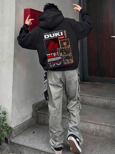 Men's single-sided printed hooded sweatshirt with bold DUKI graphic, red handprint, collage art, streetwear style, urban fashion, hip-hop design,  pockets and drawstrings, long sleeves, loose and casual, thick fabric, ideal for gifts in autumn and winter, high-quality men's clothing S to 2XL - Negro - Añade 5