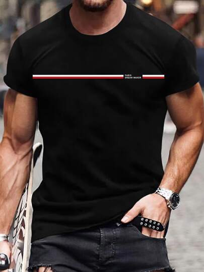 Manfinity Homme Camisetas de manga corta con cuello redondo y ajuste para hombres con dibujo gráfico de París, de estilo casual para el verano, hechas de poliéster - Negro - Añade 5