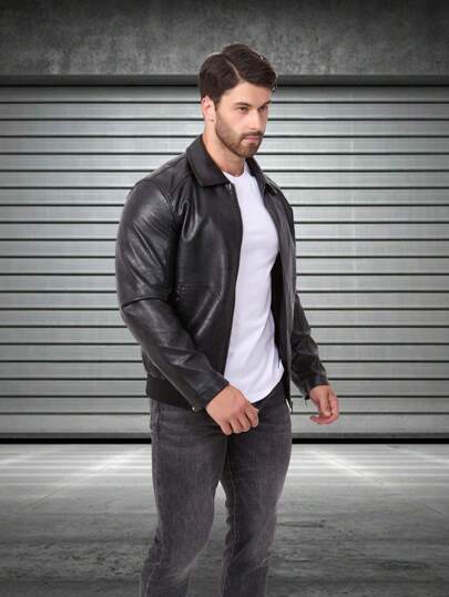 Chaqueta de moto para hombre de estilo racer, en piel sintética (PU), ajustada, con cuello alto, cremallera delantera y bolsillos, para otoño/invierno - Negro - Añade 1