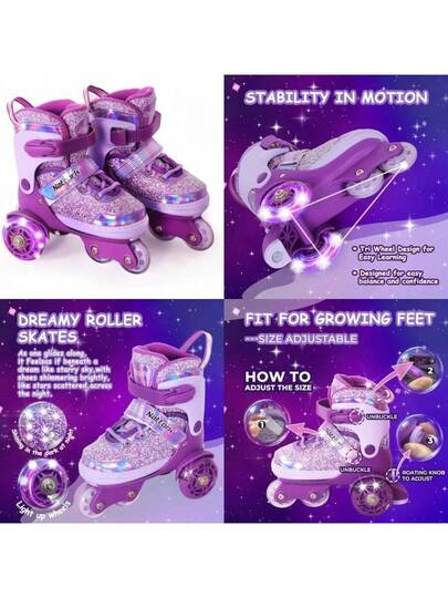 Nattork - Patines de ruedas para niños pequeños, 4 tamaños ajustables de tres ruedas para niñas de 3 a 7 años con divertidas ruedas iluminadas y protección de , regalo de cumpleaños para(Sueño púrpura X-Small(7C-9C)) - Multicolor - Añade 4