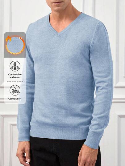 RueChic Suéter De Manga Larga Para Hombre Con Cuello En V - Celeste - Añade 5