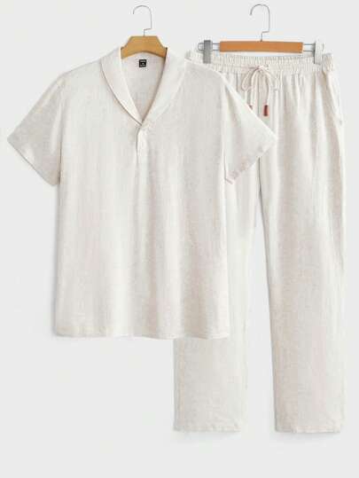 GENTILAND Conjunto de pantalón con cordón en la cintura y camisa holgada con cuello de chal para hombre - Caqui - Añade 1