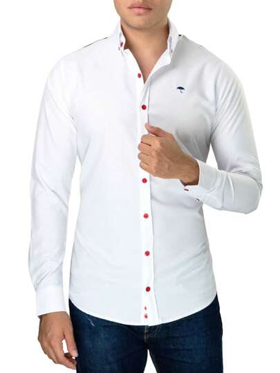 Camisa Hombre Casual Slim Fit Blanca Franja Roja y Negra - Blanco - Añade 1