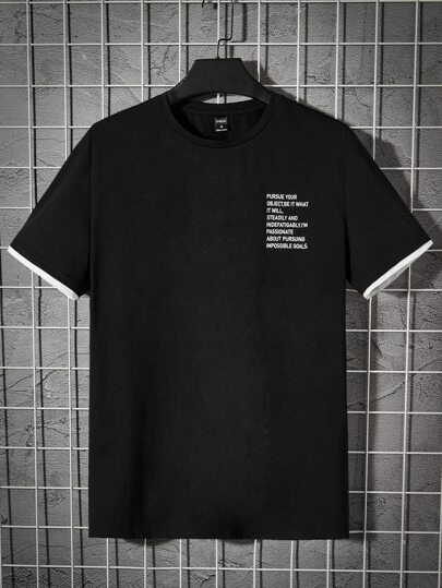 Manfinity Hombres Camiseta con estampado de slogan ribete en contraste - Negro - Añade 2