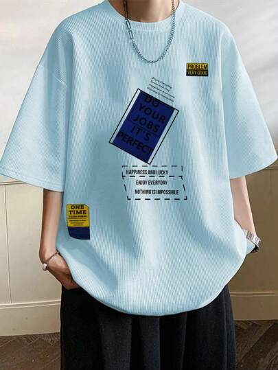 Manfinity Hypemode Hombres Camiseta de hombros caídos con estampado de slogan - Celeste - Añade 1