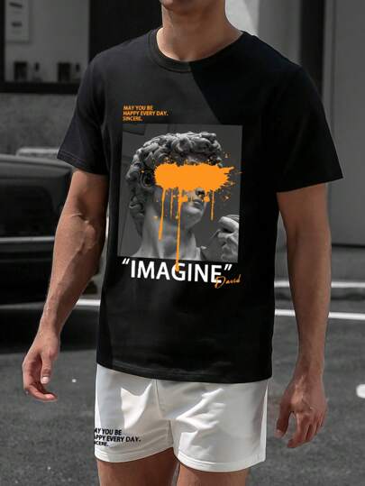 Manfinity Roghcode Hombres Camiseta con estampado de slogan & Shorts de cintura con cordón - Blanco y Negro - Añade 4