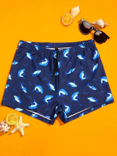 Manfinity Swimmode Hombres Shorts de natación con estampado de tiburón de dibujos animados de cintura con cordón - Azul Marino - Añade 3