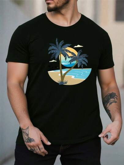 Camisetas De hombre Manga Corta para verano de cuello redondo Casual, Negra y Blanca, Playeras De hombre con estampado de dibujos estilo playa - Negro - Añade 1