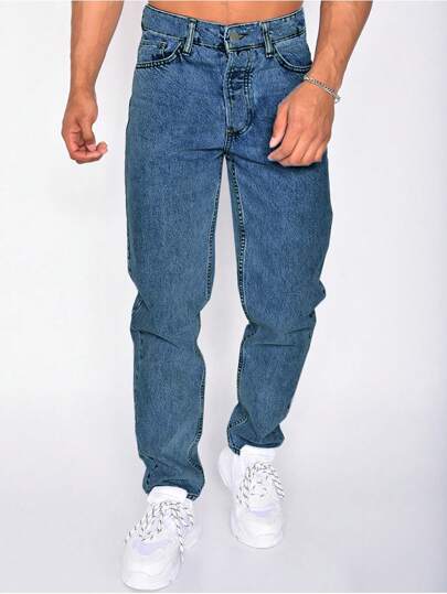 Jeans casuales de pierna recta para hombres con bolsillos en diagonal - Azul lavado medio - Añade 1