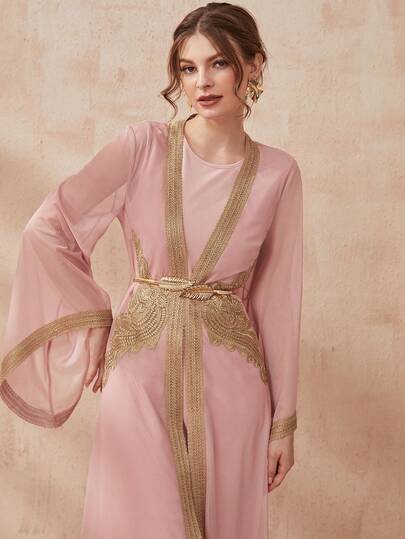 Conjunto de dos piezas de abaya de estilo árabe para mujer, compuesto por un vestido y un cárdigan con cinturón, apropiado para primavera y verano - Rosa - Añade 1