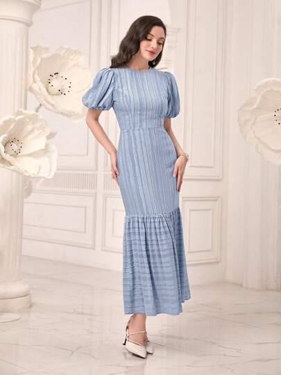 Modelyn Vestido con estampado de rayas de manga farol bajo con fruncido sin cinturón - Neblina azul - Añade 4