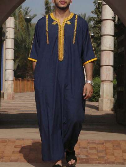 Túnica corta de manga corta bordada marroquí para hombres musulmanes, túnica marroquí holgada para hombres musulmanes - azul real - Añade 1