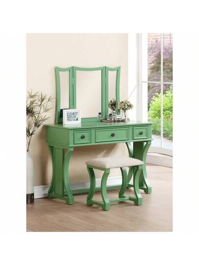 Conjunto de tocador moderno y único de 1 pieza con taburete, espejo plegable, cajones, de color verde manzana, en MDF y chapa - Verde antiguo + Tablero de partículas + Moderno como en la imagen - Añade 20