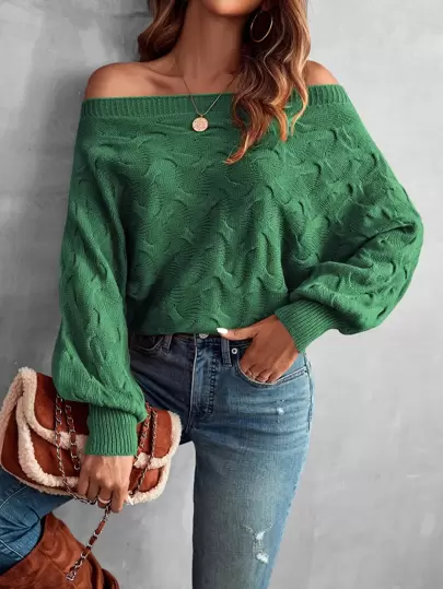 SHEIN LUNE Jersey de hombros descubiertos de manga murciélago con textura - Verde - Añade 5