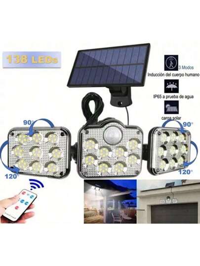Lámpara Solar Exterior con Sensor de Movimiento - 138LED Lampara Solar de Tres Cabezales con Mando a Distancia, 3 Modos, Iluminación gran angular de 270°, Impermeable Luz Solar Exterior - Negro - Añade 7