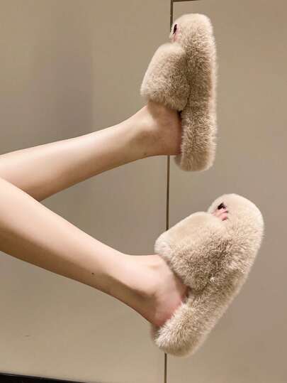 Pantuflas de plataforma con puntera abierta de unicolor de piel sintética para otoño/invierno - Caqui - Añade 1