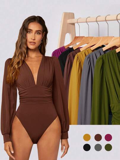 BizChic Body de cuello profundo de manga farol fruncido - Marrón Chocolate - Añade 1