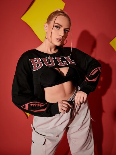 Top corto con estampado fútbol americano & de letra de hombros caídos sin sujetador - Negro - Añade 2