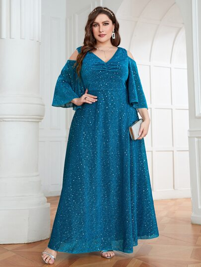 SHEIN Belle Vestido de dama de honor de hombros descubiertos fruncido brillante - Azul - Añade 3