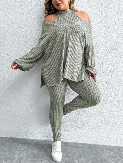 Calvaya Talla grande Leggings con camiseta de hombros descubiertos bajo con abertura - Verde - Añade 2