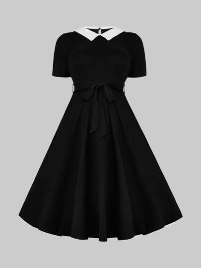 SHEIN Clasi Vestido con cinturón de cuello en contraste - Blanco y Negro - Añade 3