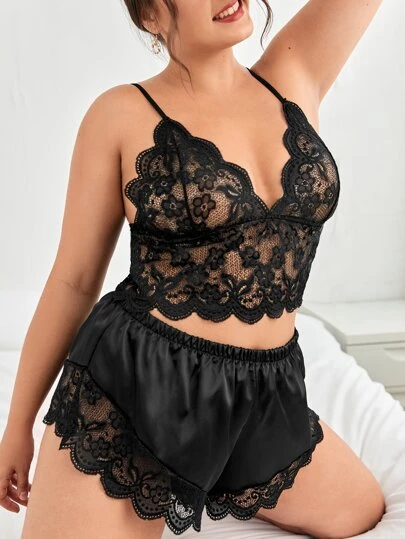 Conjunto de lencería sexy de encaje negro de talla grande - Negro - Añade 2