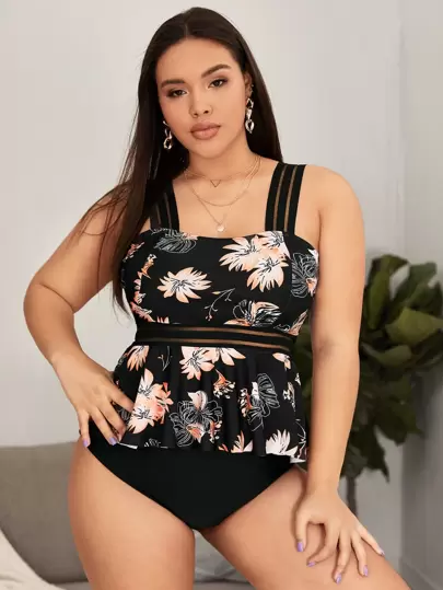 Tankini de verano con cintura alta, volantes en el bajo y malla de contraste con estampado floral para tallas grandes - Negro - Añade 1